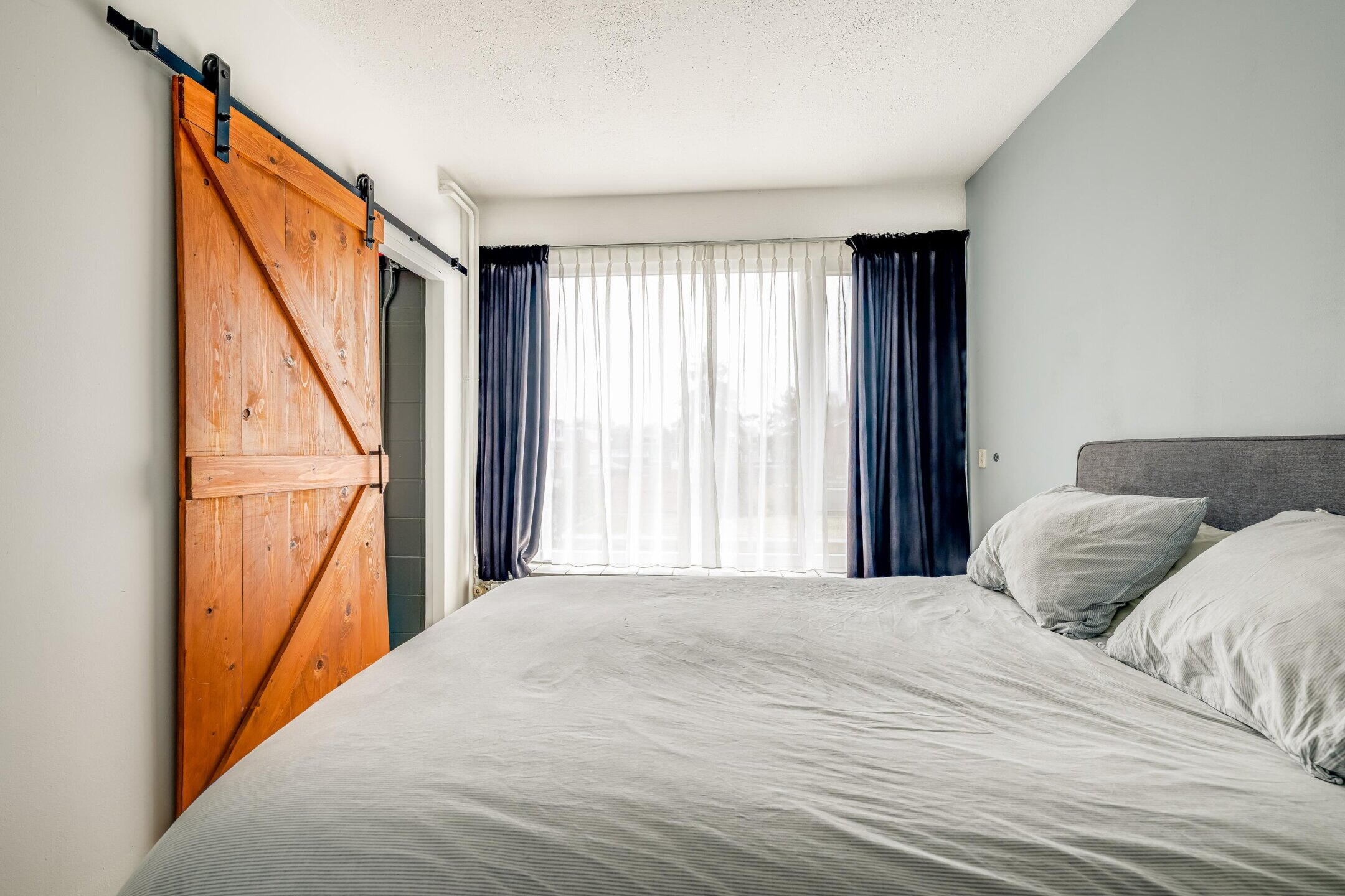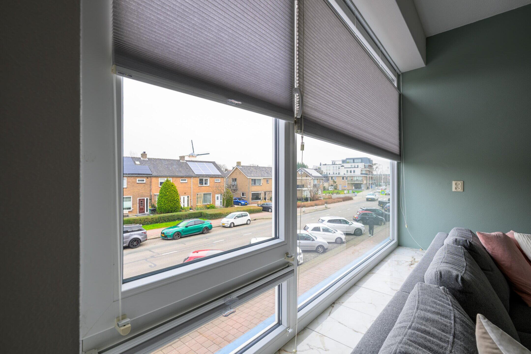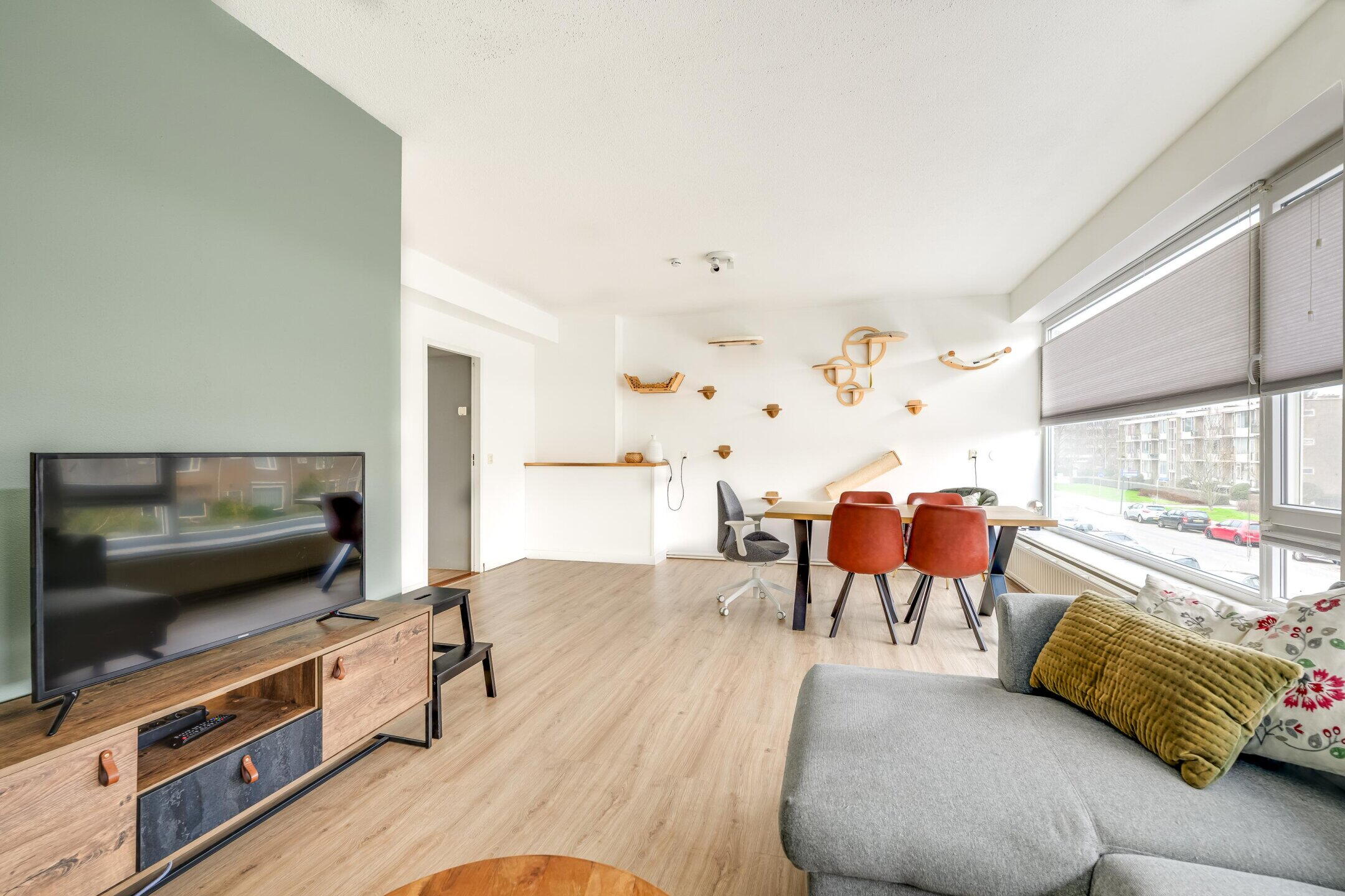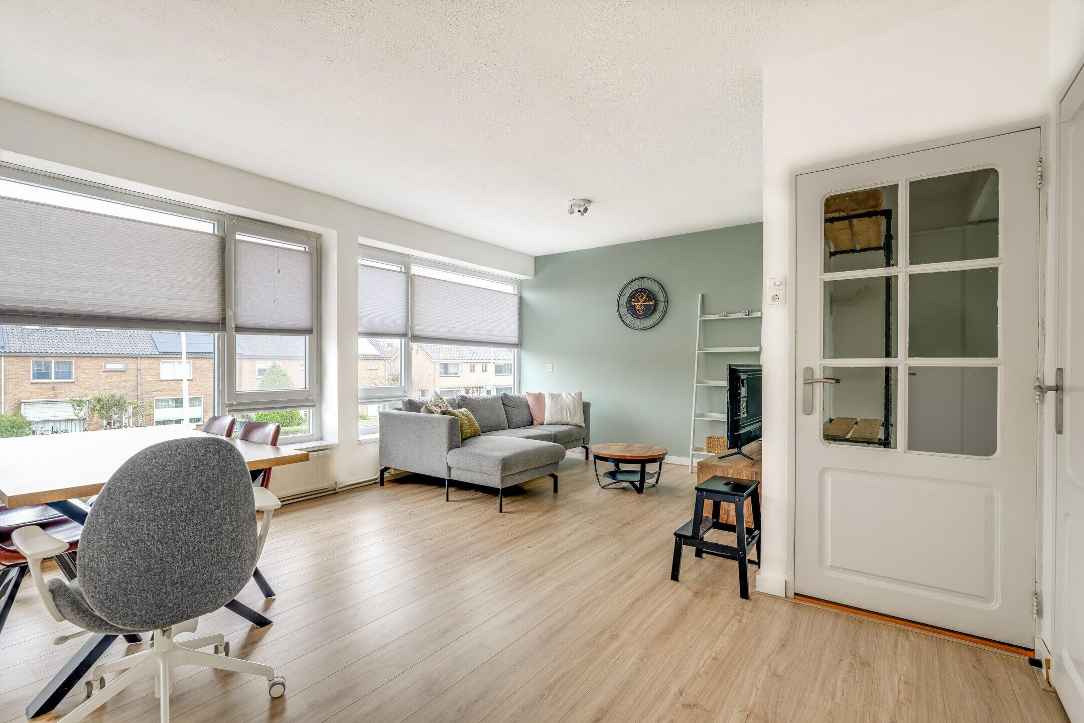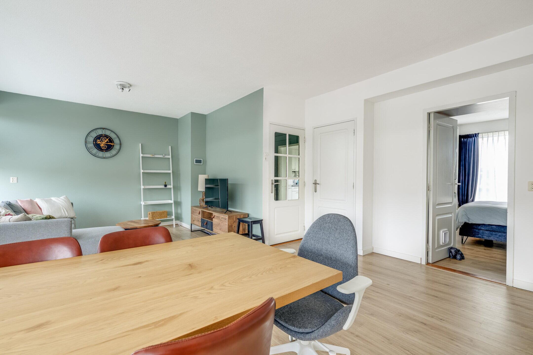 De woonkamer is ruim opgezet en beschikt over grote raampartijen, wat zorgt voor een prettige lichtinval. De ruimte biedt voldoende plaats voor zowel een comfortabele zithoek als een eethoek. Vanuit de woonkamer is de slaapkamer bereikbaar. Deze is goed van formaat en beschikt over vaste kastruimte.