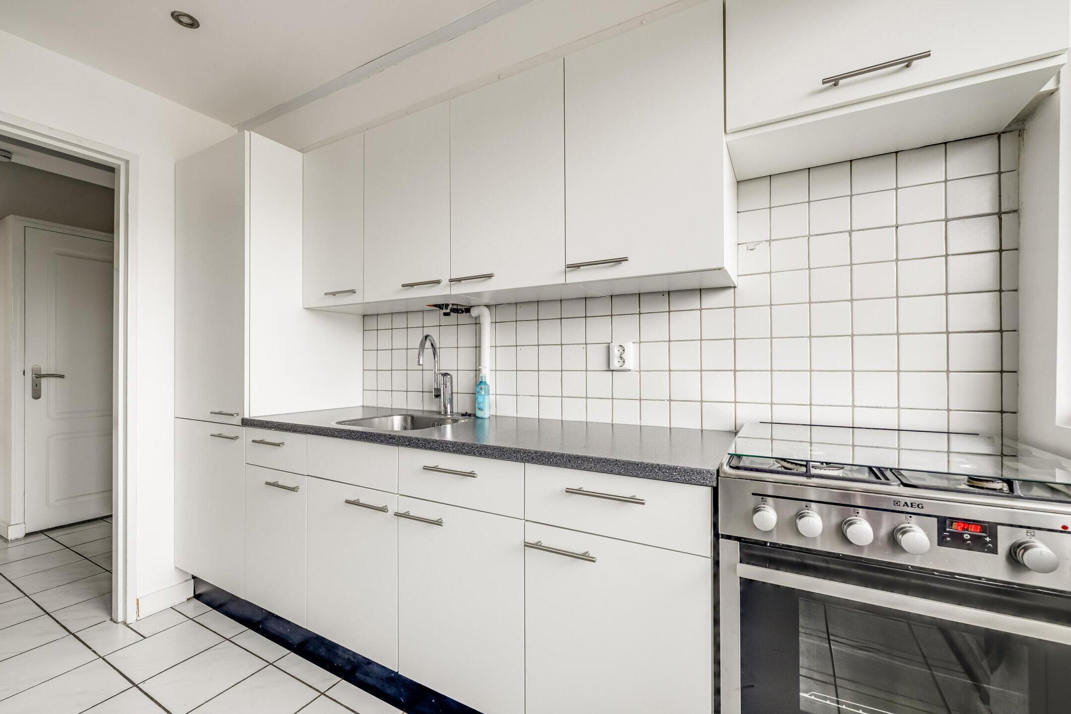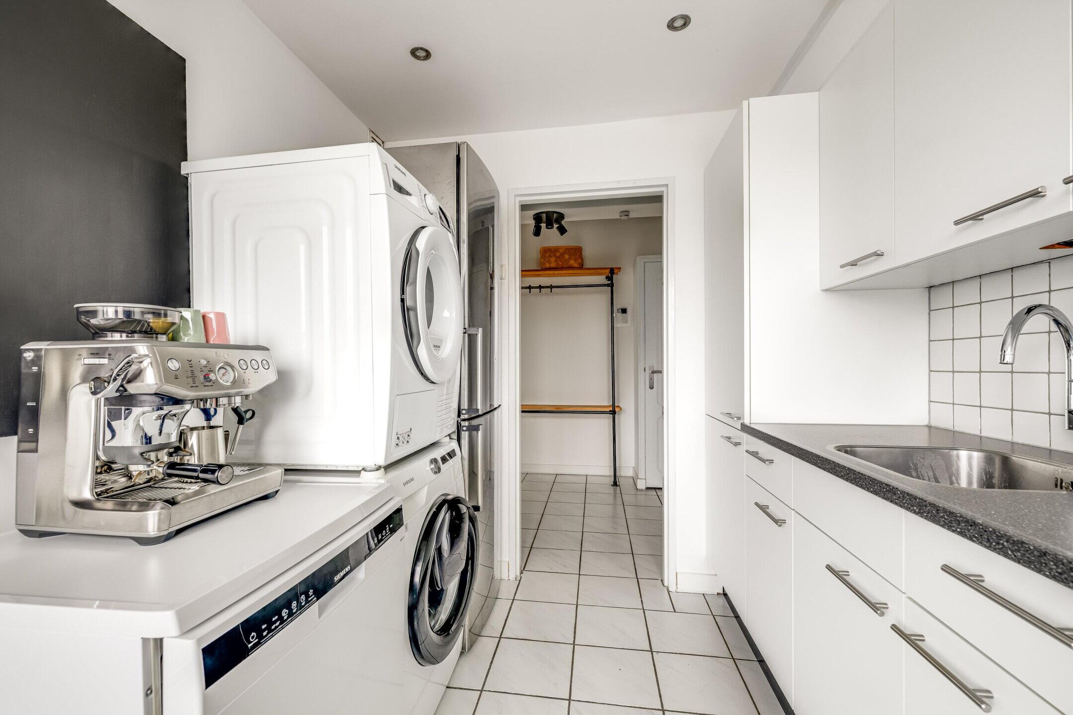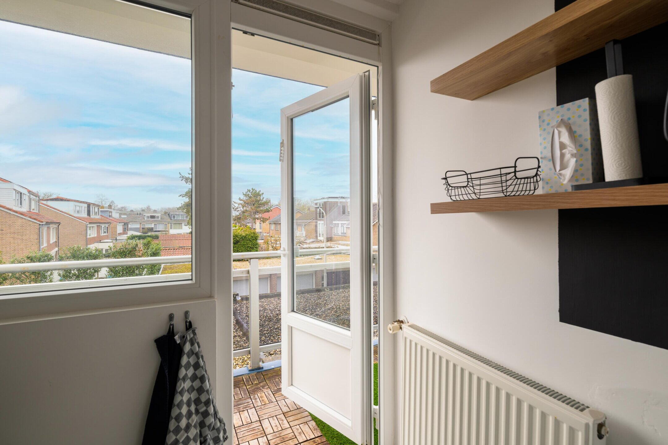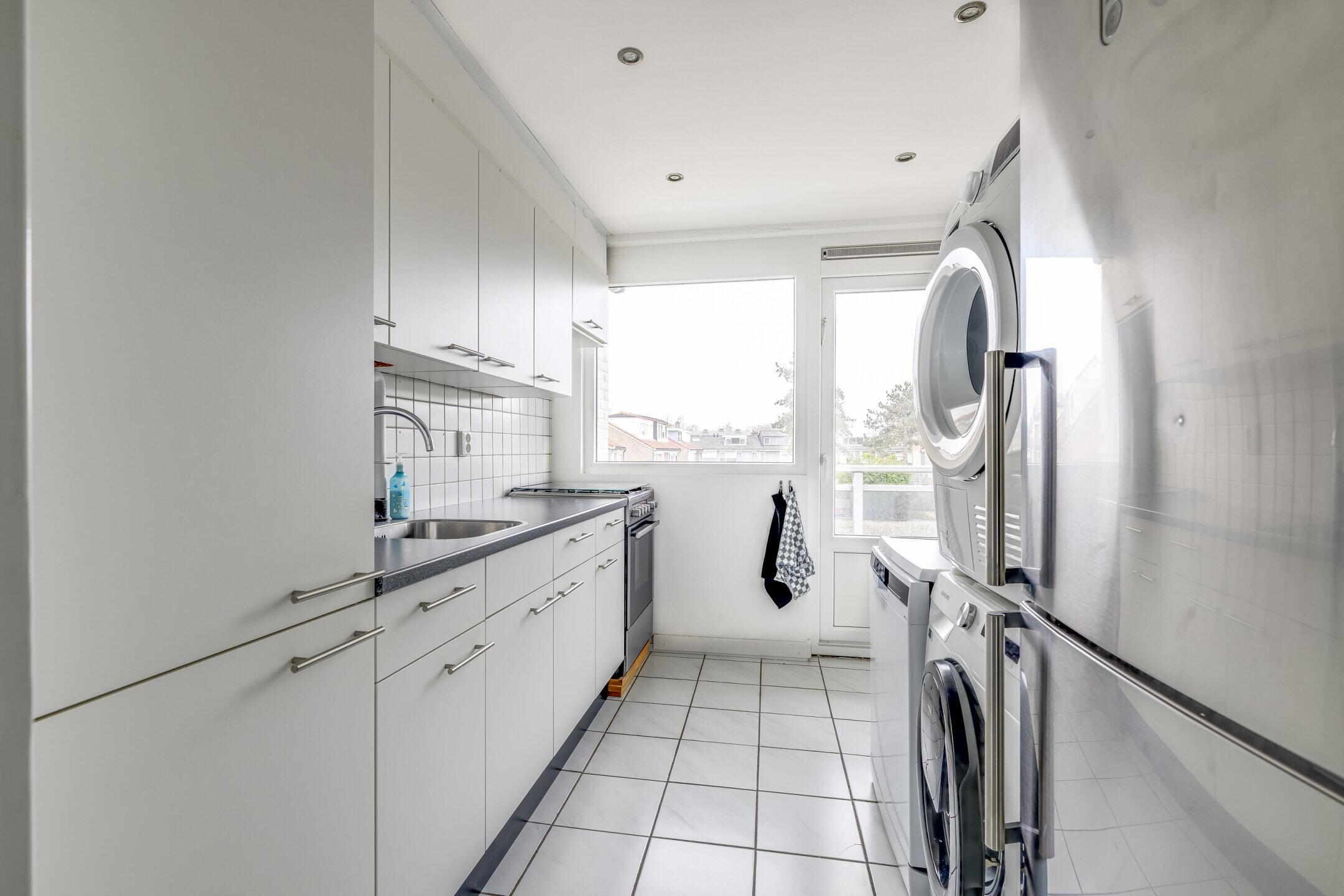 De keuken ligt aan de achterzijde van het appartement en geeft toegang tot het balkon, dat is gelegen op het zuidwesten en dus de gehele dag van de zon kan genieten. De keuken is praktisch ingericht en voorzien van een koel-vriescombinatie, oven en een 4-pits gasfornuis. Tevens bevinden zich hier de aansluitingen voor de wasmachine en droger.