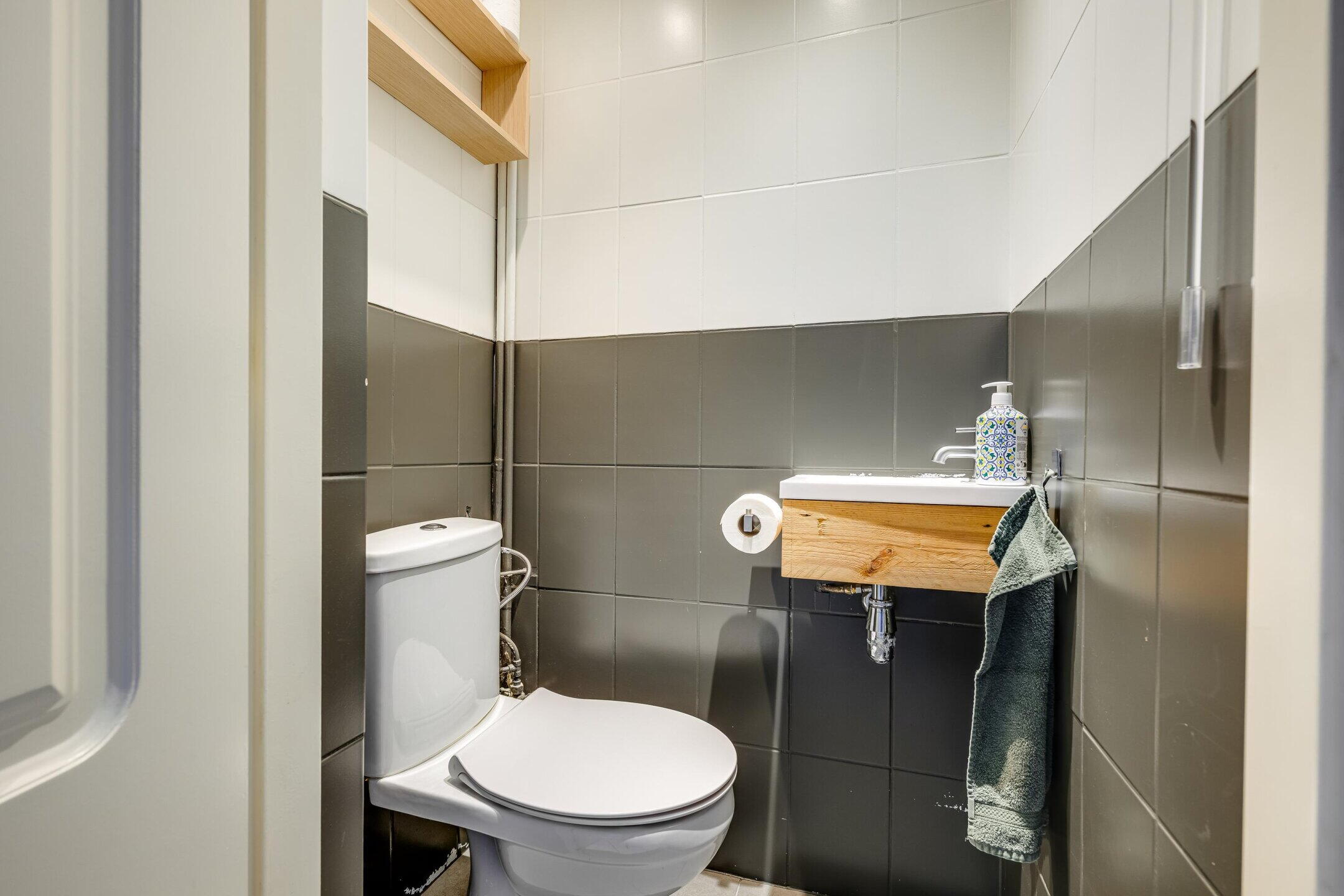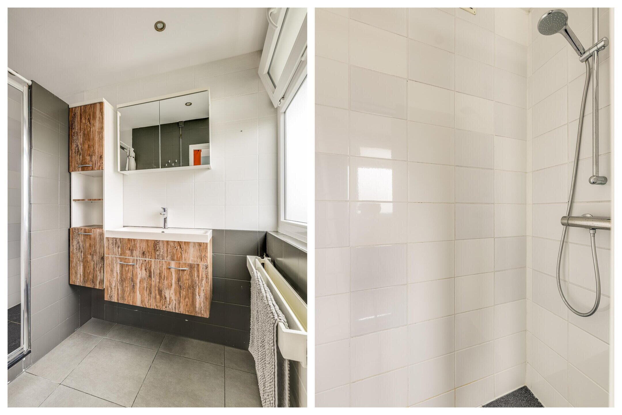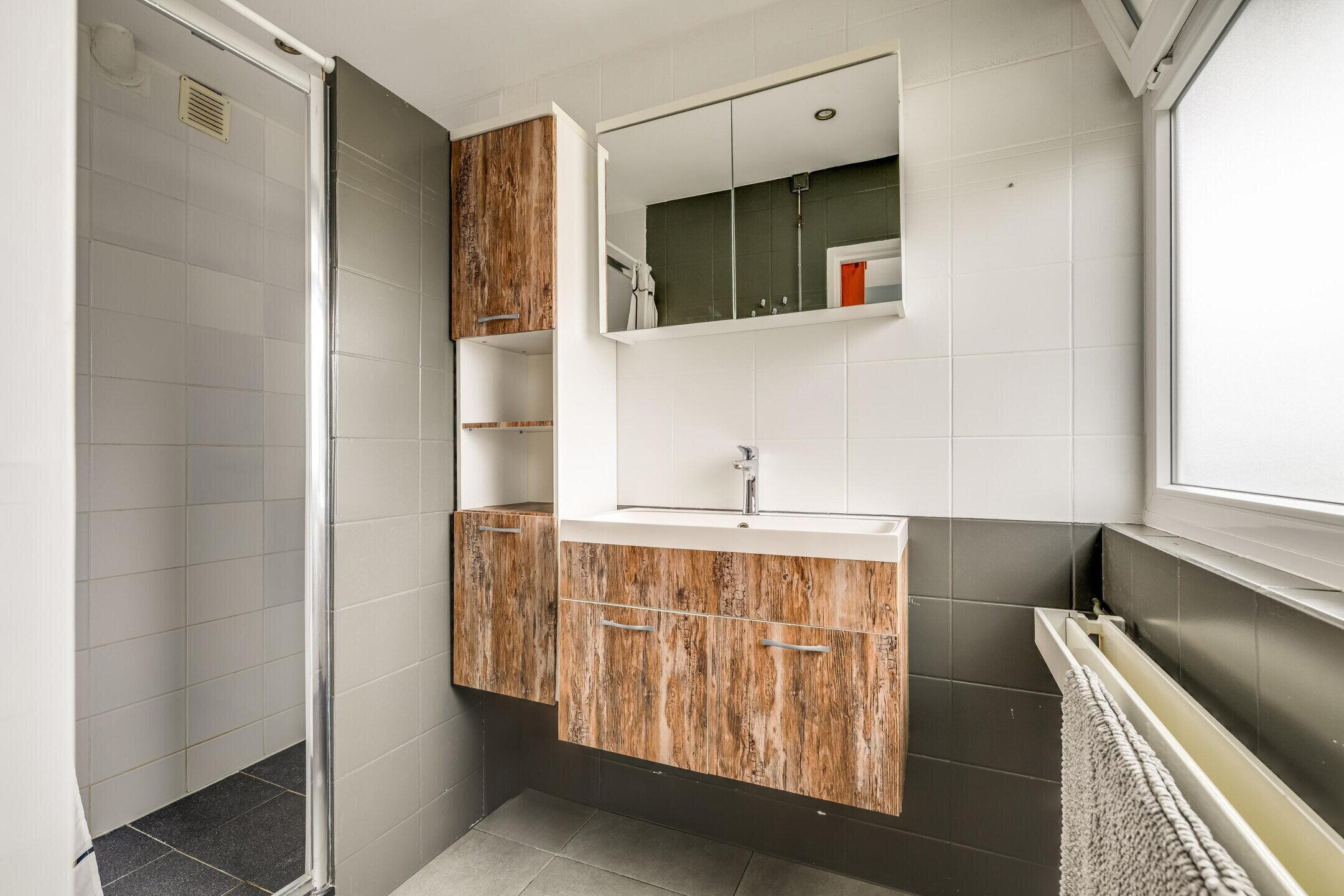 Aansluitend bevindt zich de badkamer, die modern is uitgevoerd en voorzien van een inloopdouche en een wastafel met meubel.