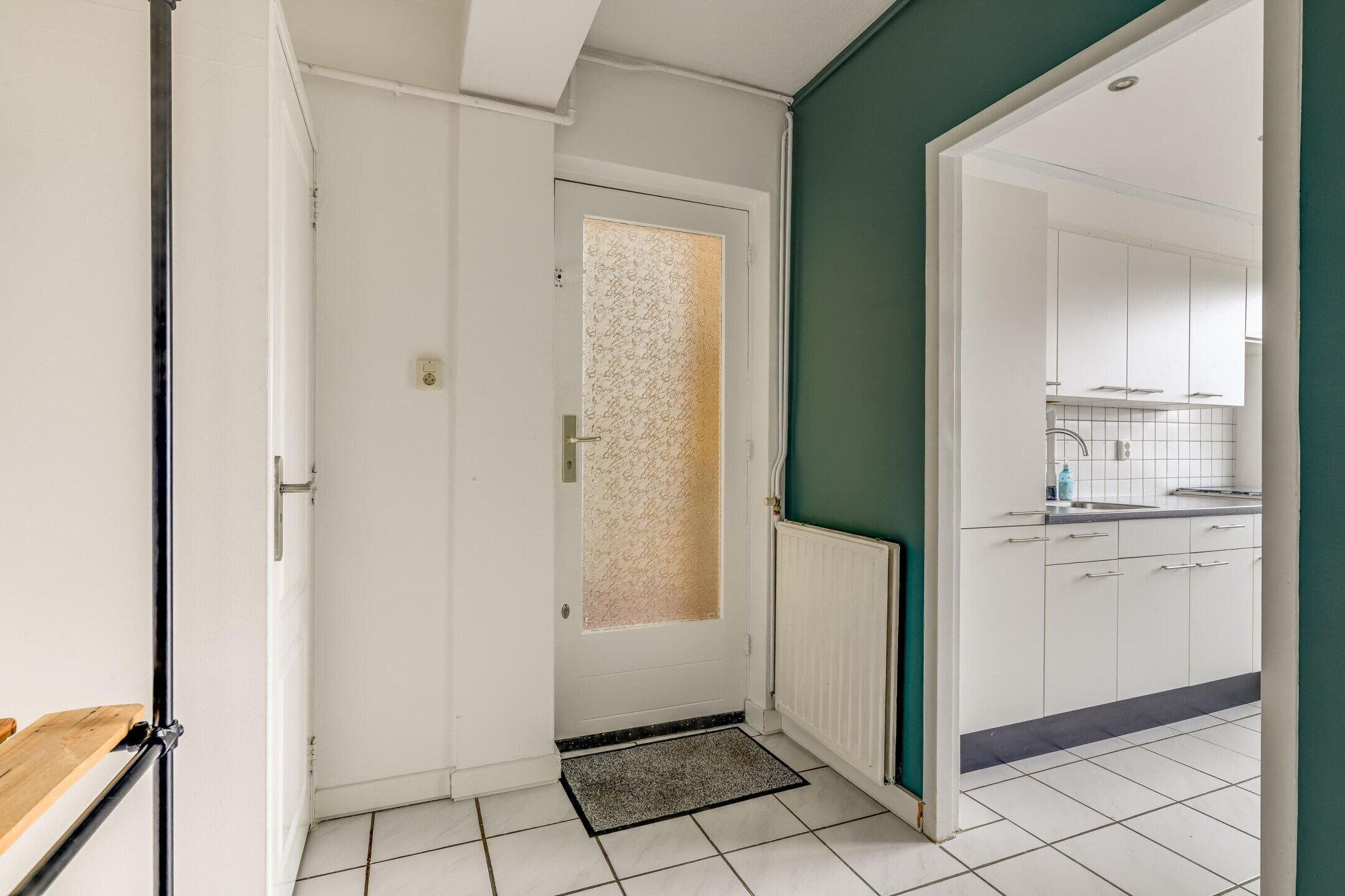 Via de entree komt u binnen in de hal, vanwaar de woonkamer en de keuken bereikbaar zijn. In de hal bevindt zich tevens ook het separate toilet.